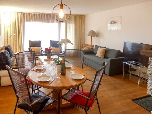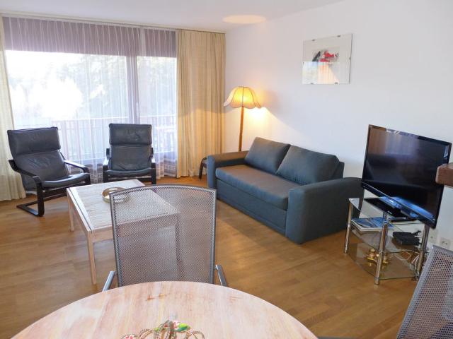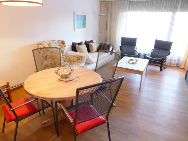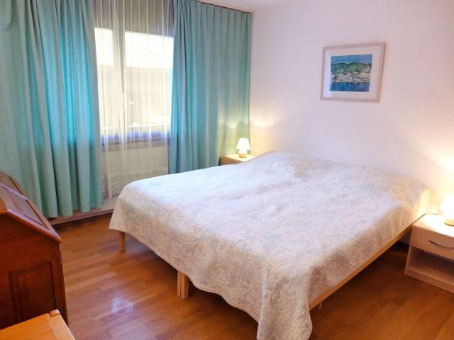 Apt 2 pièces 60 m2 au 1er étage. Séjour/salle à manger avec 1 divan-lit double (140 cm, longueur 200 cm), TV (câblée) (écran plat). 1 chambre avec 2 lits (90 cm), lavabo et WC séparés. Cuisine (3 plaques de cuisson, four, lave-vaisselle, grille-pain, bouilloire électrique, four micro-ondes, cafetière électrique, appareil à raclette). Bain/WC. Balcon, situation sud. Meubles de terrasse. Vue partielle sur les montagnes. A disposition: coffre-fort, sèche-cheveux. Internet (Connexion WIFI, gratuit). Place de parking No 4 près de la maison, hauteur 210 cm. Veuillez noter: logement non-fumeur. (place extérieure couverte), chambre côté parking.