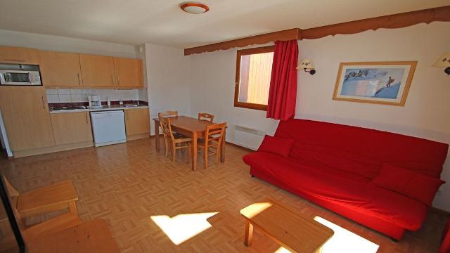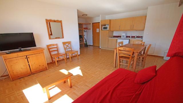 - L'entrée donne sur un grand séjour avec canapé-lit en 140 et le coin cuisine ouverte équipée avec micro-ondes, lave-vaisselle. Le balcon est exposé sud-est.