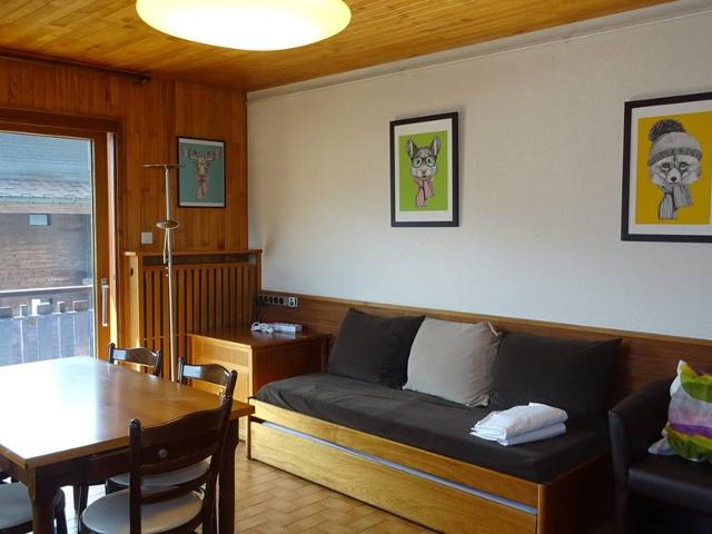 DESCRIPTIF : Entrée avec placard - Une chambre équipée d' 1 lit 2 personnes (160X200) + placard - 1 chambre équipée de 2 lits simples (100X200) + rangement - Séjour salle à manger équipé d' 1 banquette 1 personnes (90) + 1 lit tiroir 1 personne (90), baies vitrée donnant sur un balcon avec mobilier de jardin, Vue centre village - Coin cuisine ouvert sur salle à manger entièrement équipée (lave-vaisselle, 4 feux gaz, grand frigidaire avec compartiment congélateur, hotte aspirante, grille-pain, bouilloire, cafetière électrique, four, micro-ondes avec batterie de cuisine ) - 1 WC indépendant - 1 salle de bain (baignoire, lavabo, bidet). Animaux non acceptés. Non fumeurs.