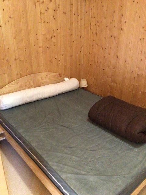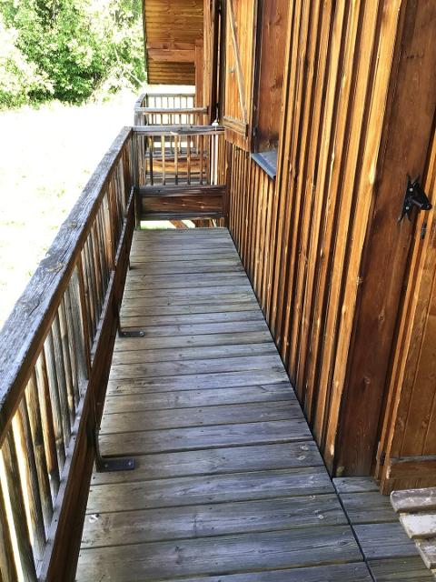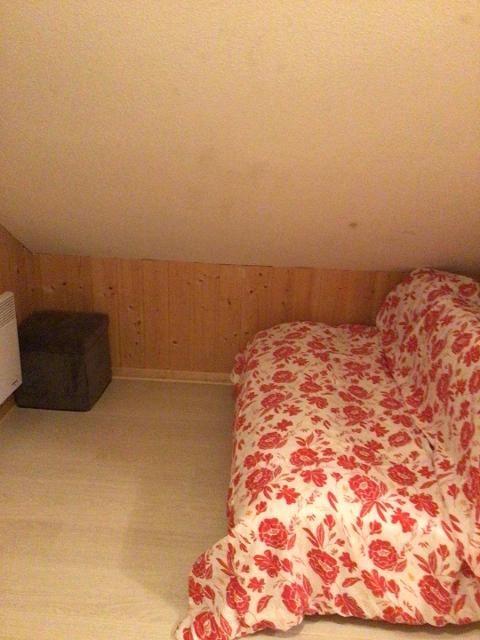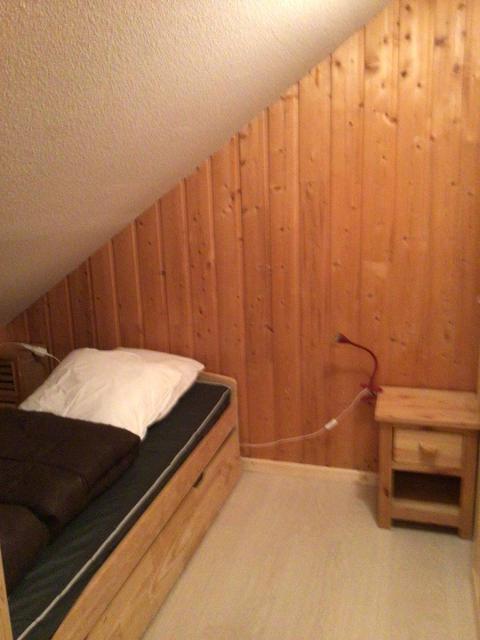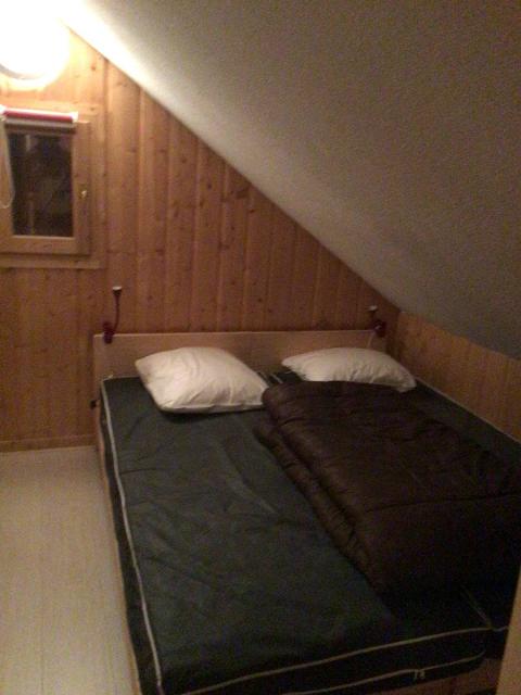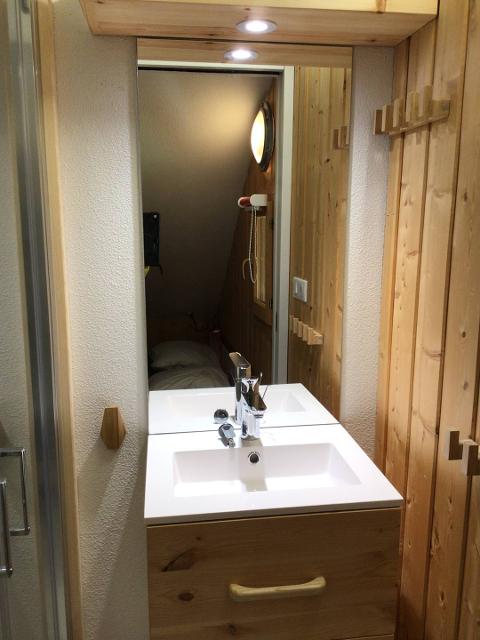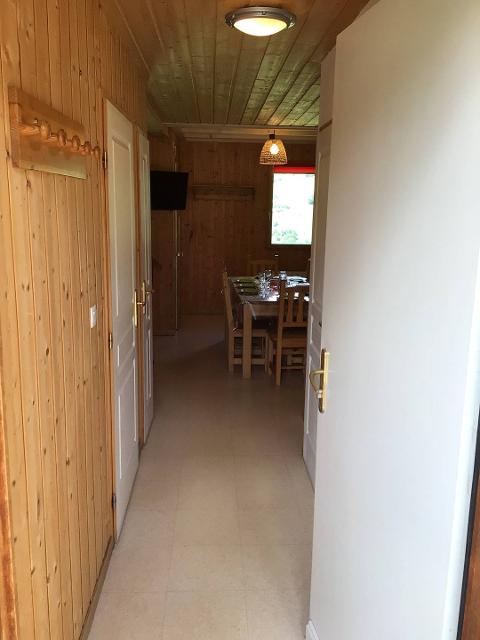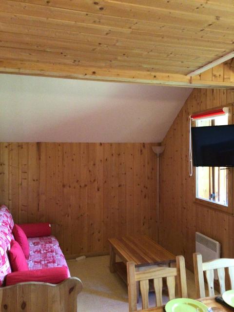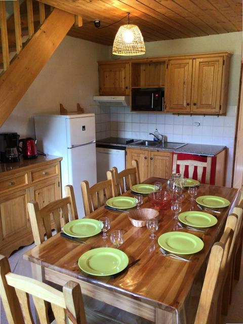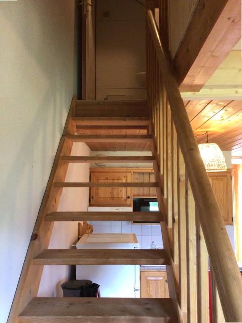 Appartement 8 couchages dans chalet comprenant un séjour avec un canapé gigogne, un coin cuisine équipée, une chambre double, une salle de bain, un wc et à l'étage : une mezzanine, un coin couchage simple, une chambre avec deux lits simples et salle de douche , un wc indépendant.