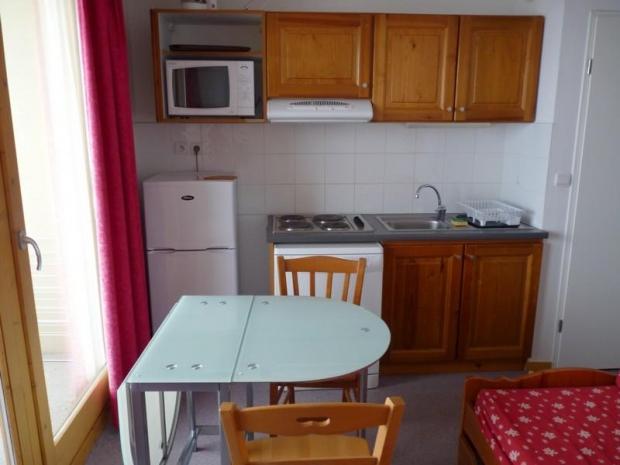 Séjour avec coin cuisine équipé de 4 plaques électriques, lave-vaisselle, réfrigérateur, combiné four/micro ondes, rangements.