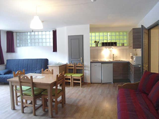 Il se compose d'une entrée, une salle d'eau avec wc, un coin cuisine équipé et un vaste séjour avec 2 lits superposés, un convertible pour 2 personnes et 1 banquette lit gigogne pour 2 personnes. Petite terrasse attenante au studio.