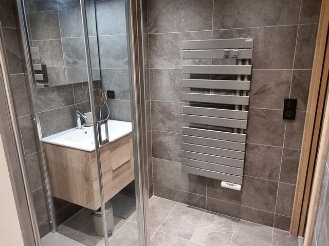 - 1 chambre double (lit de 180cm x 200cm) en suite, avec placard, tv, douche, vasque, wc et