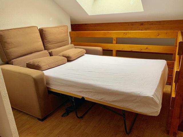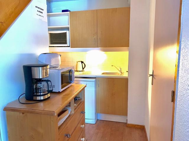 - Au rez de chaussée : une entrée avec placard, salle de bains et WC indépendant. Cuisine équipeé d'un lave vaisselle, d'une plaque électrique 4 feux, d'un micro-ondes, d'une bouilloire, d'une cafetière, d'un grille pain. Séjour comprenant une banquette gigogne et son balcon plein sud.