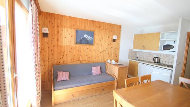 Séjour avec une banquette gigogne, balcon exposé sud-ouest.