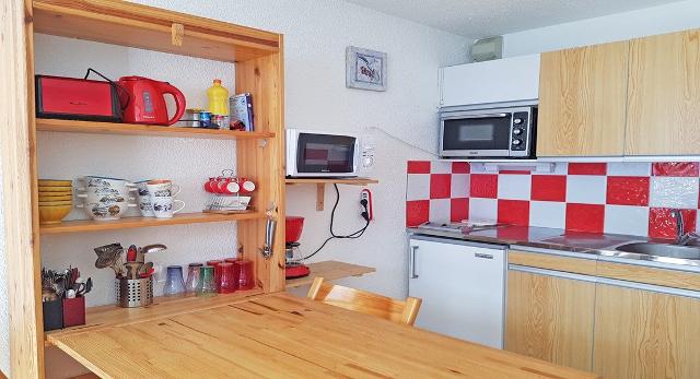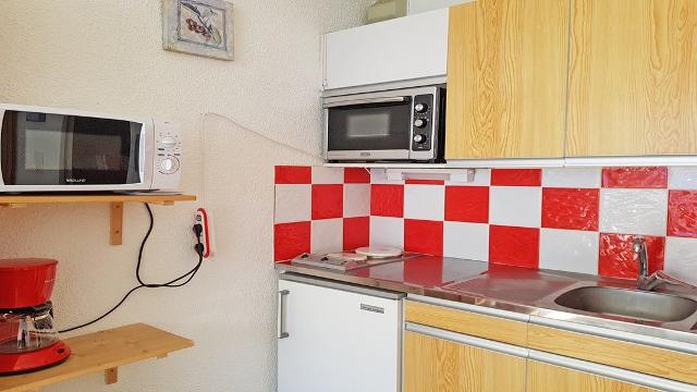 Kitchenette équipée : 2 plaques électriques, four micro-ondes et mini-four, cafetière filtre, bouilloire électrique et grille pain. Balcon en exposition sud sur les pistes