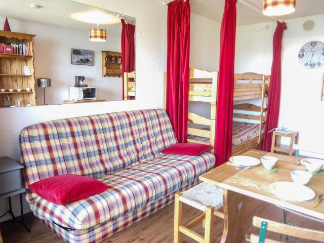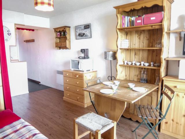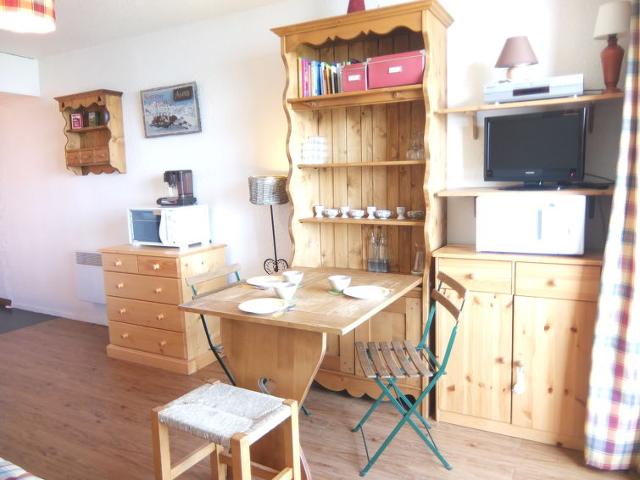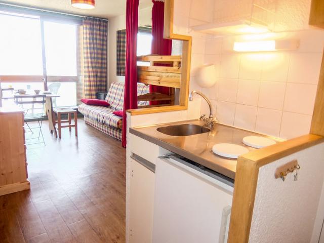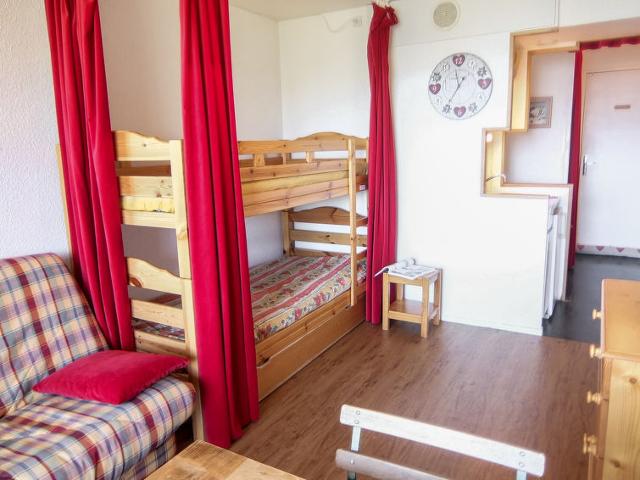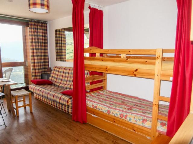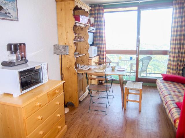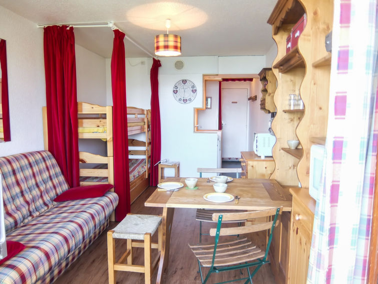 Studio 22 m2 au 18ème étage, situation nord. Séjour/salle à manger avec 1 divan-lit double (130 cm, longueur 190 cm), 1 x 2 lits superposés (80 cm, longueur 190 cm), TV. Sortie sur le balcon. Coin cuisine (2 plaques de cuisson, four, four micro-ondes, cafetière électrique). Bain/WC. Sol en parquet. Balcon 4 m2, situation nord. Belle vue sur les montagnes et la vallée. Veuillez noter: logement pour non fumeurs. Détecteur de fumée.