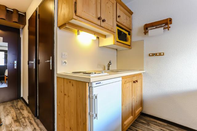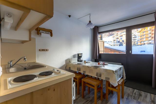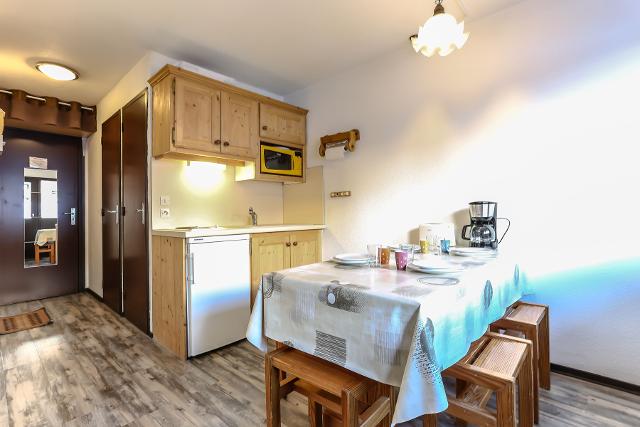 En poursuivant, vous avez le séjour avec une kitchenette équipée. Vous disposez d'une table à manger, avec une vue sur la station et les montagnes en arrière plan. Sur le côté droit du séjour, vous trouverez l'espace chambre (attention, il n'y a pas de porte de séparation entre la chambre et le séjour) où le couchage se compose d'une banquette lit et d'un lit gigogne. Couvertures et oreillers à votre disposition.