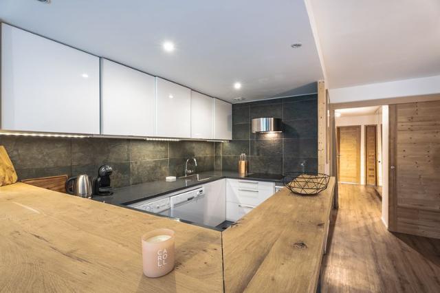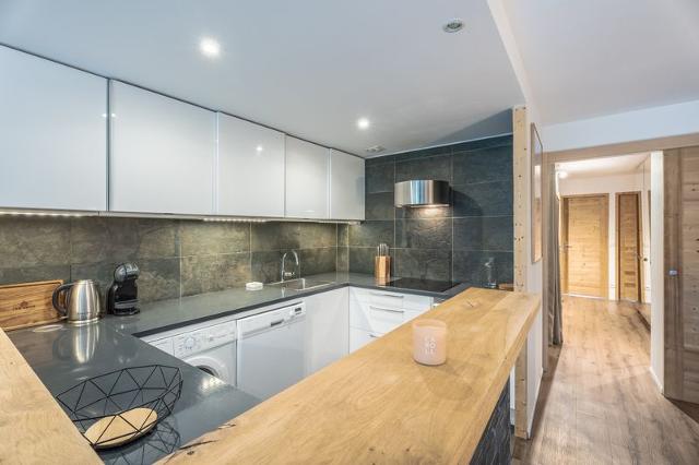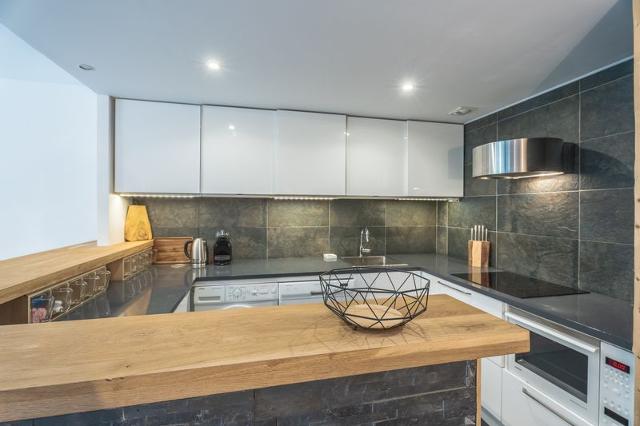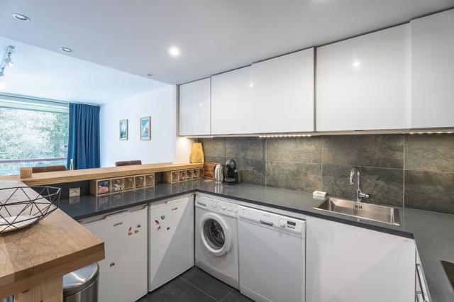 - Cuisine ouverte sur le séjour, toute équipée : Four-micro-onde, plaque à induction, deux petits réfrigérateurs, machine à café Krups, lave-vaisselle, lave-linge, bouilloire, grille pain, appareil à raclette, table à manger avec des chaises.