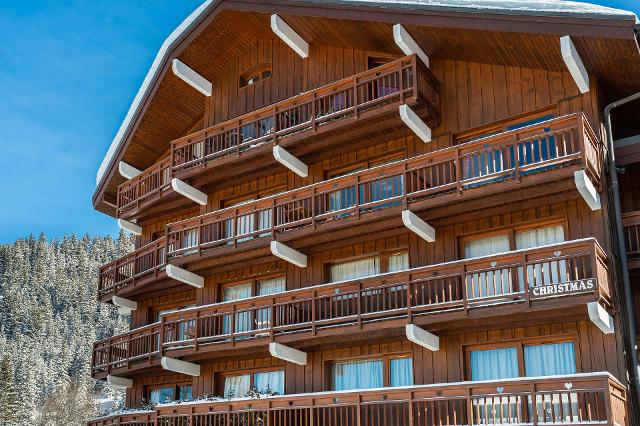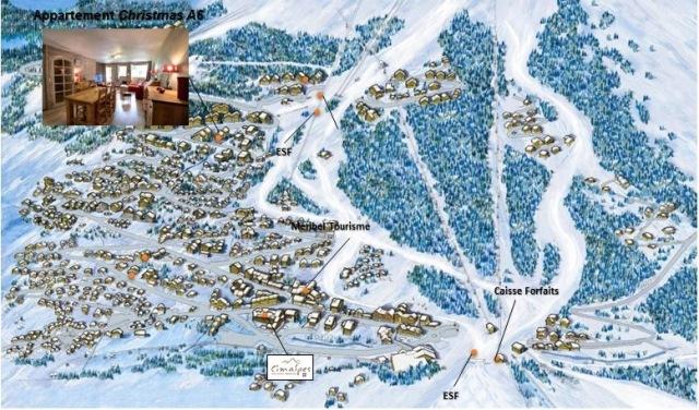 Résidence Christmas située sur les hauteurs de Méribel. L'arrêt de navette gratuite menant au départs des pistes est aux pieds de la résidence.
