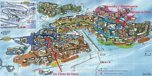Centre ville à 100 m. Commerces à 100 m. ESF à 300 m. Pistes à 50 m.La résidence LES CIMES DE CARON est située à l'entrée de la station près du centre commercial de Caron et du nouveau centre sportif Le Board, avec un accès pistes à 50 mètres. Elle est équipée d'un ascenseur.