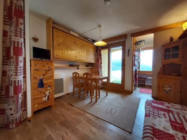 La terrasse avec vue plongeante sur la vallée est exposée Nord. Le casier à skis est dans la résidence.