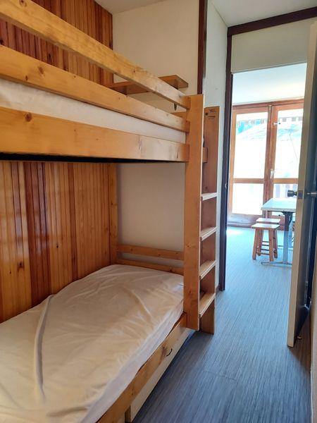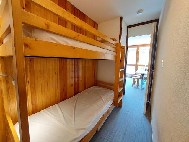 1er étage, surface de 24m² avec balcon, exposition Sud. Séjour avec canapé convertible et TV. Entrée avec lits superposés. Cuisine séparée avec micro-ondes, réfrigérateur, et plaques électriques. Salle de bains avec toilettes.
