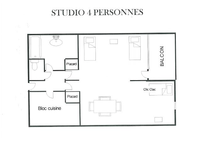 Ce studio divisible par cloison mobile de 27 m², est situé au 3ème étage (avec ascenseur) et est équipé pour 4 personnes. Il comprend :