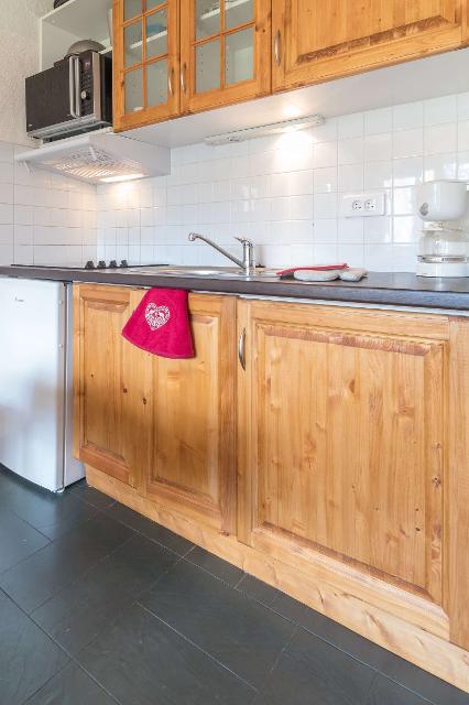 - d'un coin cuisine avec un réfrigérateur, une plaque électrique avec deux feux, un micro-onde, un mini four, une cafetière.