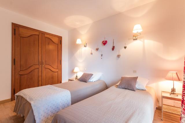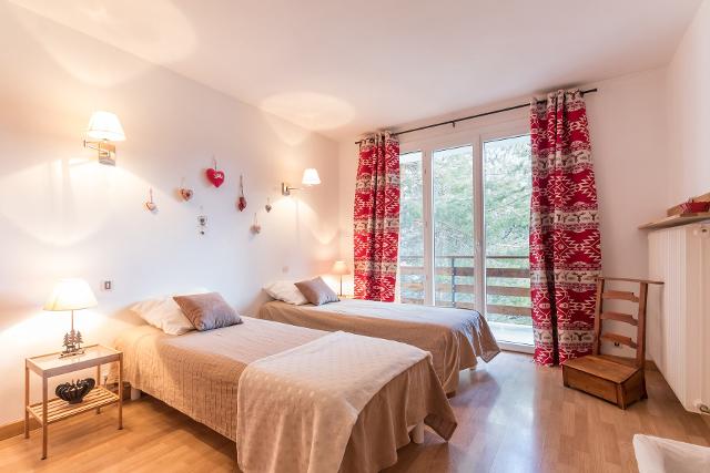 Ce trois pièces en location est agencé de la manière suivante : une chambre avec deux lits simples (pouvant faire lit double en 160 cm) et ouverte sur un balcon exposé plein sud, une salle de bain, des wc indépendants et un double séjour avec balcon exposé sud. Une partie du séjour peut être fermée par une porte coulissante et propose un coin nuit équipé d'un canapé rapido en 140 pour deux personnes et de lits superposés. La deuxième partie comprend un séjour avec un canapé, une télévision, un coin repas et un poêle à bois.