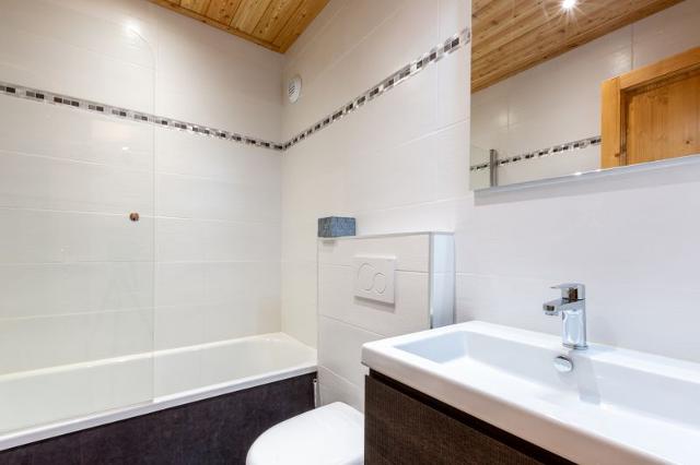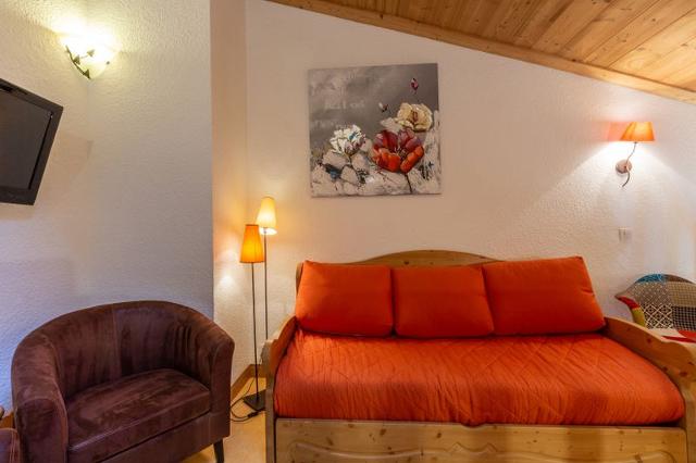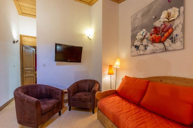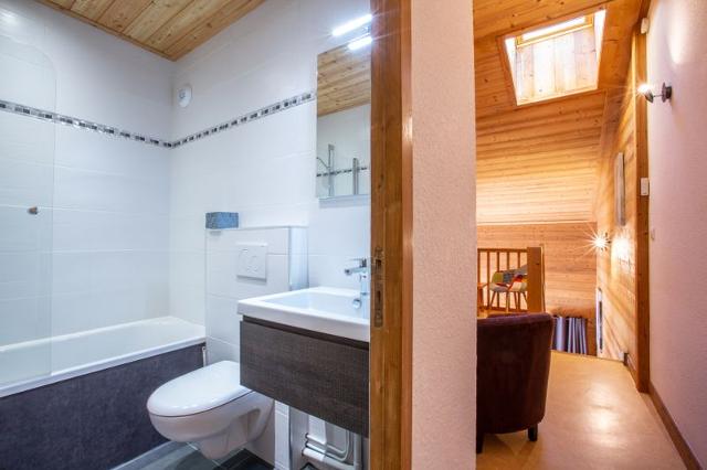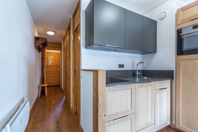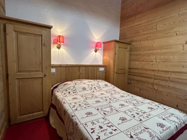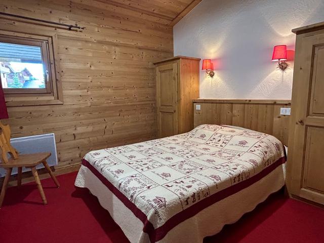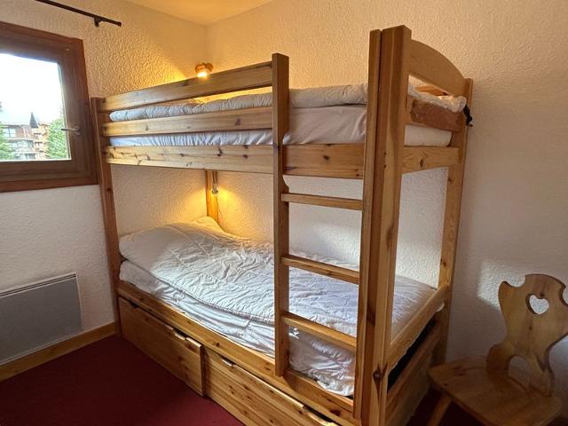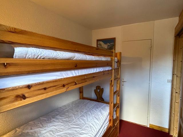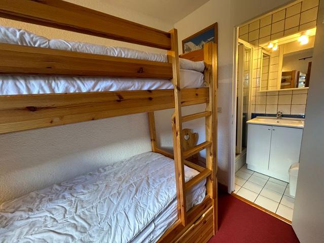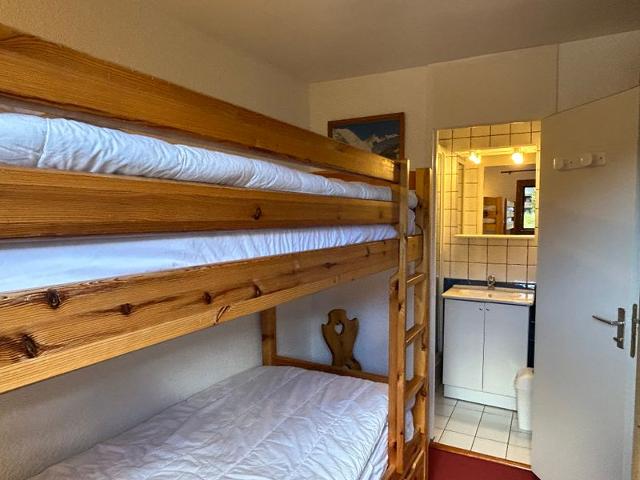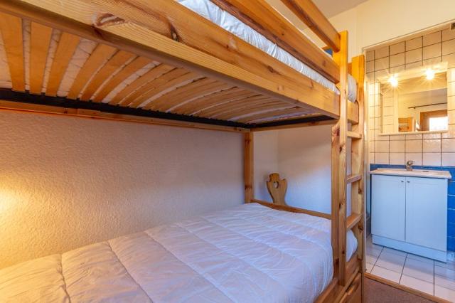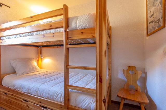 Au rez-de-chaussée un petit sas d'entrée vous accueille. Une chambre en suite composée d'un ensemble de lits superposés (90x190) et salle de douche attenant. Un couloir, avec WC séparés, débouche sur le séjour avec kitchenette équipée d'un réfrigérateur, lave-vaisselle, four combiné micro ondes, cafetière, grille-pain, bouilloire ainsi qu'un appareil à raclette. Le canapé se déplie pour permettre 2 couchages (120x180). Balcon avec vue plongeante sur les pistes, Mont Vallon et Aiguille du Fruit en fond.