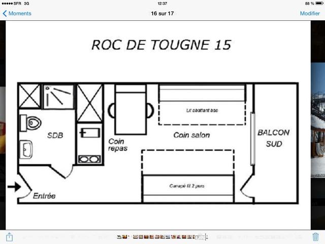 L'appartement Roc de Tougne n°15 d'une superficie de 48m² avec une suite parentale est exposé Sud avec vue panoramique sur le Mont-Vallon, Saulire et Mottaret. Double balcon avec accès direct sur les pistes pour un départ skis aux pieds.