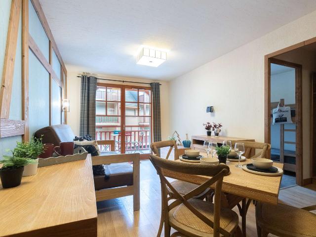 -Un séjour avec 1 canapé convertible 2 places et TV , ouvert sur une Cuisine équipée (plaques vitrocéramique, micro-ondes, lave-vaisselle)
