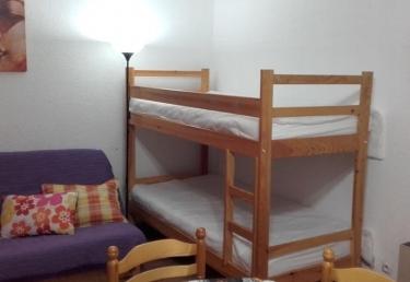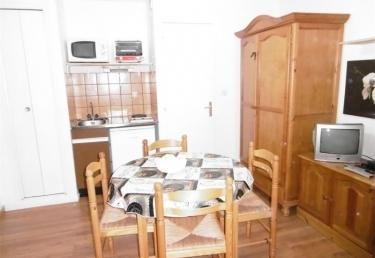 Studio de 17 m² + balcon exposé Nord-Ouest vue forêt, entrée directe dans le séjour avec convertible 2 personnes type lits gigognes + 2 lits superposés, téléviseur, coin cuisine équipé (2 plaques chauffantes, micro-ondes, mini-four, évier, réfrigérateur, rangements), salle de bains/WC (baignoire, lavabo, WC).