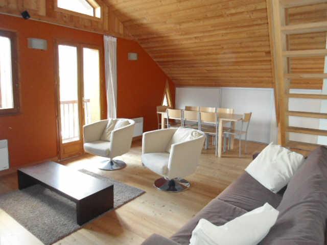 Il se compose d'une entrée, une première chambre avec 1 lit 2 places, une seconde chambre avec 2 lits 1 place, une salle de bain avec wc, une salle d'eau avec wc, une troisième petite chambre avec 2 lits superposés, un agréable séjour lumineux avec un convertible 2 places donnant sur un balcon avec une vue imprenable sur les pistes et le village, une cuisine équipée avec lave-vaisselle, lave-linge, four et micro-ondes, une mezzanine sous le toit avec 2 lits simples.