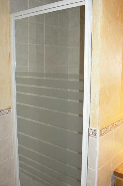 Salle de bain avec cabine de douche et wc séparés. Placard à l'entrée.