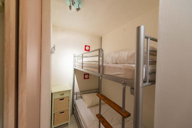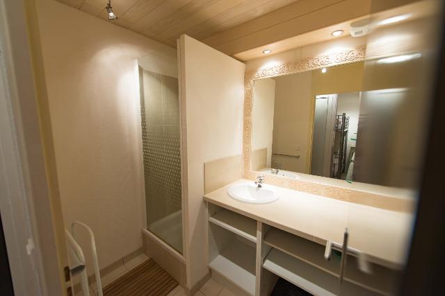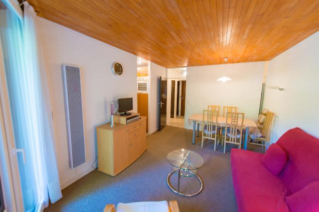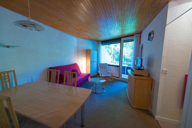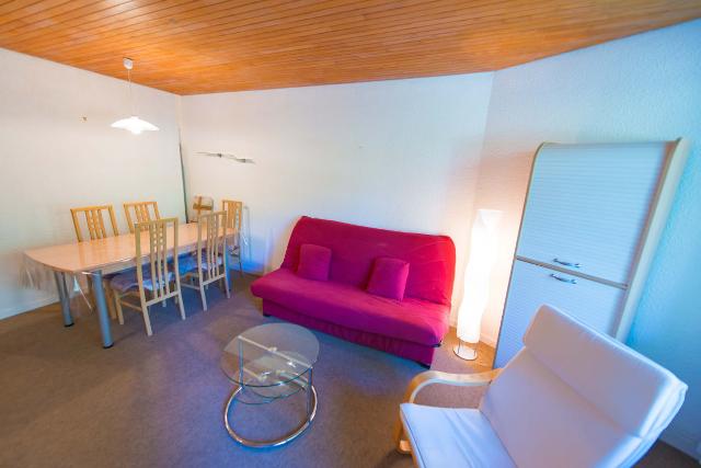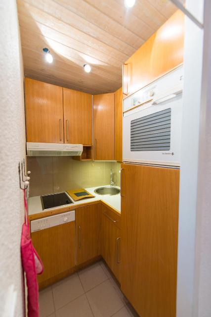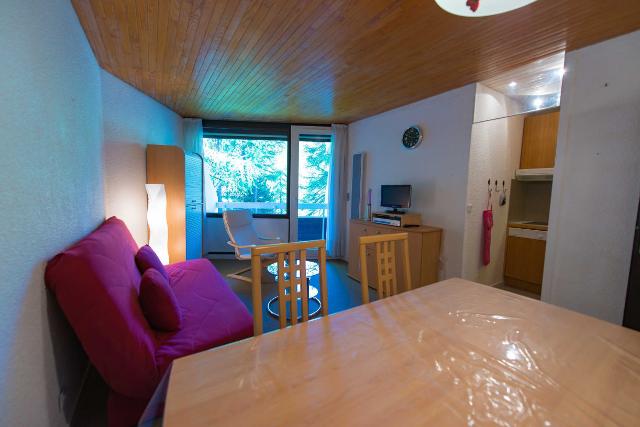 Studio coin montagne de 28m² équipé pour 4 personnes, situé au pied des pistes, exposé SUD/OUEST avec vue sur les montagnes. Séjour avec canapé convertible en 140 et télévision. Coin montagne avec 2 lits superposés. Coin cuisine avec 2 plaques électriques, lave-vaisselle et four. Salle d'eau avec douche et WC.