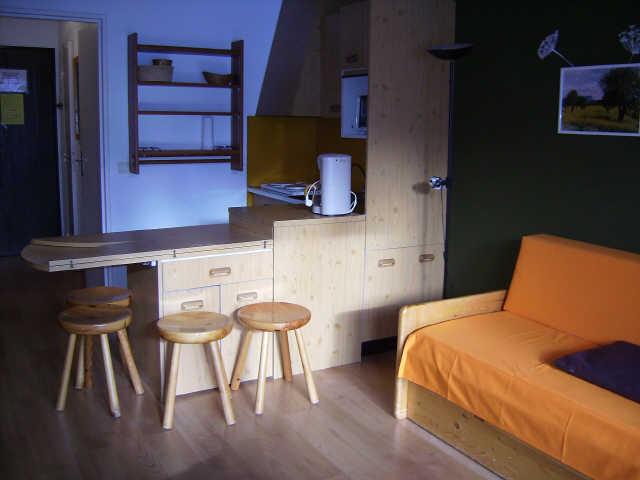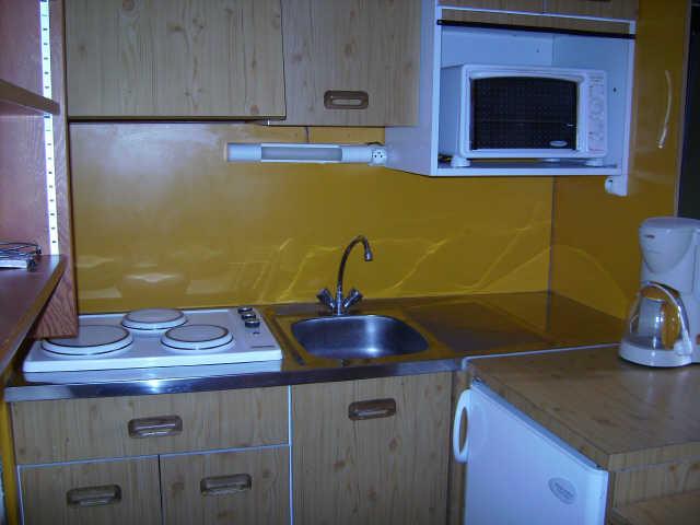 Studio coin nuit de 26 m² situé au 3ème étage avec ascenseur et en exposé Sud (balcon), vue sur les pistes . Il y a 1 lit gigogne dans le séjour, 2 lits 1 place superposés dans l'entrée. La salle de bain avec baignoire est indépendante des toilettes. La kitchinette est équipée d'un réfrigérateur, d'un four micro ondes, de 3 plaques électriques, d'un four. Téléviseur couleur 50 cm.