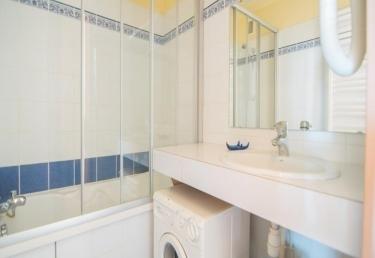 Sanitaires : salle de bain avec baignoire équipée d'un lave-linge, WC séparés.