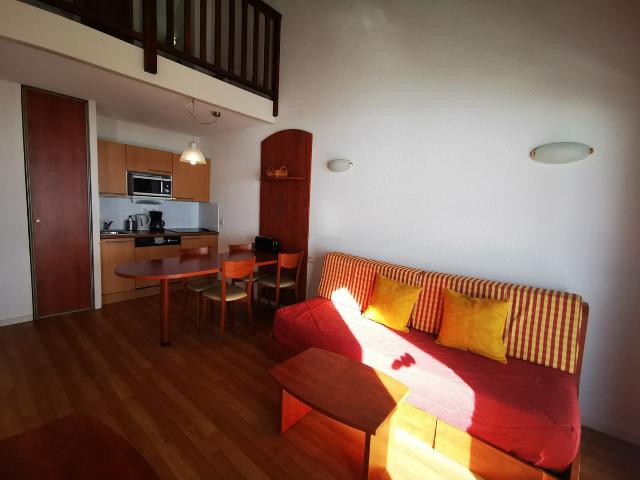 Duplex 7 couchages situé au 2ème étage sans ascenseur (accès par escalier niveau -1), surface de 49 m² avec terrasse, exposition sud. En RDC, Séjour équipé d?une télévision, d?un canapé lit en 160, une chambre avec 1 lit en 160, salle de bains, toilettes, à l'étage, en mezzanine un lit en 90, une chambre avec 2 lits en 90, salle d'eau avec toilettes. Coin cuisine dans séjour avec plaques induction, micro-ondes multifonctions, cafetière à filtre, bouilloire, grille pain, lave vaisselle, réfrigérateur 120 L (pas de compartiment congélateur). Sol en parquet.Couettes et oreillers. Casier à ski en RDC. Emplacement de parking intérieur n°81.( hauteur 1.95m).