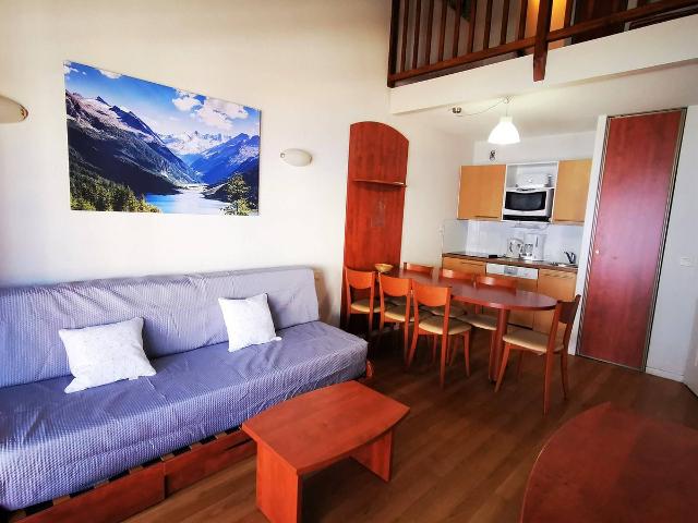 Duplex 7 couchages situé au 2ème étage sans ascenseur (accès par escalier niveau -1), surface de 49 m² avec terrasse, exposition sud. En RDC, Séjour équipé d’une télévision, d’un canapé lit en 160, une chambre avec 1 lit en 160, salle de bains, toilettes, à l'étage, en mezzanine un lit en 90, une chambre avec 2 lits en 90, salle d'eau avec toilettes. Coin cuisine dans séjour avec plaques induction, micro-ondes multifonctions, cafetière à filtre, bouilloire, service à raclettes, grille pain, lave vaisselle, réfrigérateur 120 L (pas de compartiment congélateur). Sol en parquet.Couettes et oreillers. Casier à ski en RDC. Emplacement de parking intérieur n°40.( hauteur 1.95m).