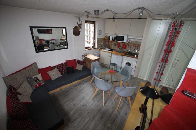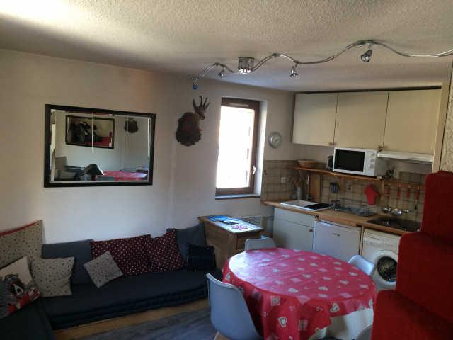 Superficie d'environ 30m². Au 4ème étage sans ascenseur, entrée placard, séjour cuisine : réfrigérateur, lave-linge, micro-ondes combiné, plaques vitriocéramiques. Canapé SANS COUCHAGE, télévision.