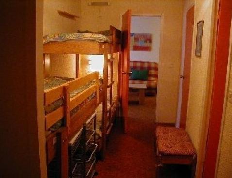 3 lits superposés en entrée, séjour avec canapé lit, salle de bains et toilettes séparées, coin cuisine.
