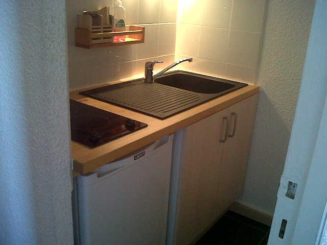 Cuisine équipée avec 2 plaques vitrocéramiques, four, réfrigérateur et four micro ondes.