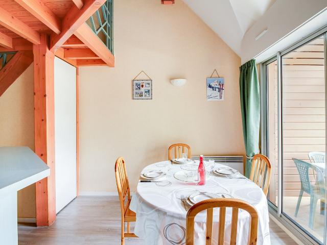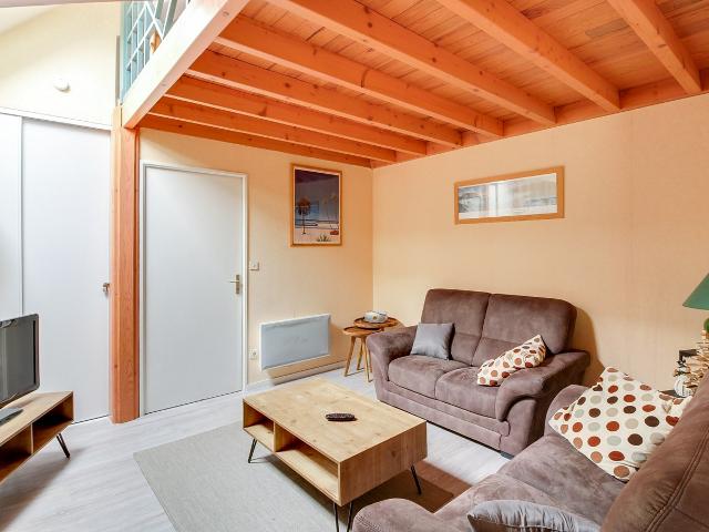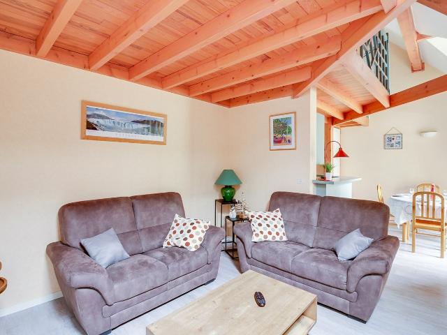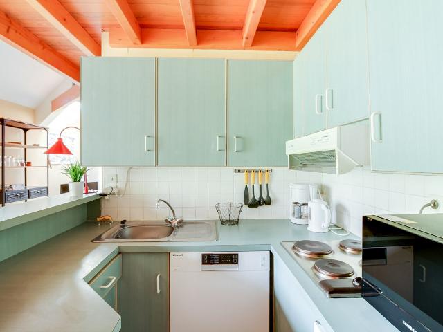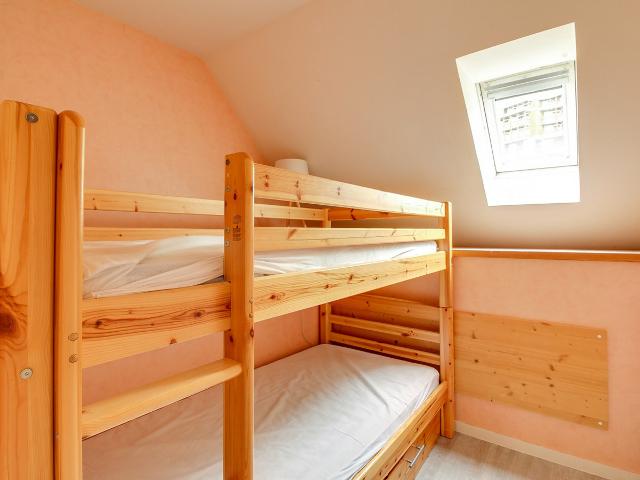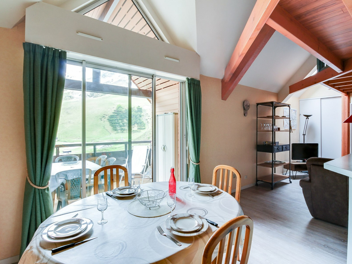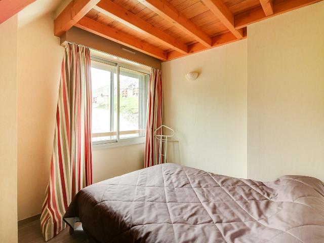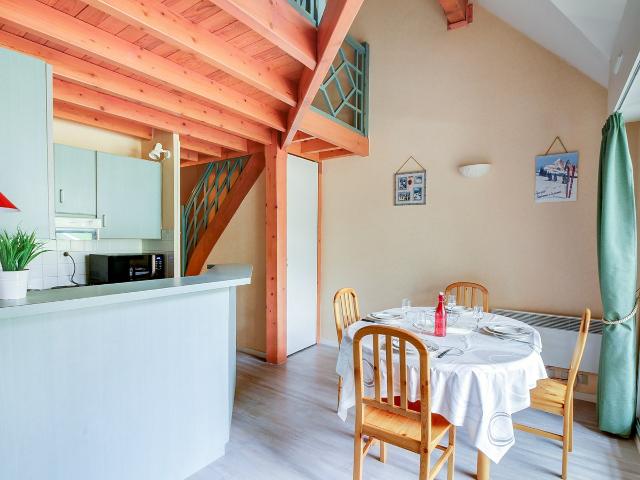 Duplex au 4ème étage, accès par escalier (3 étages). Surface de 60m² avec balcon Sud, face aux pistes. Séjour équipé d?une télévision, coin salon. Cuisine ouverte sur coin repas entièrement équipée : lave vaisselle, réfrigérateur (table top), micro ondes, cafetière filtre, grille pain, bouilloire, auto cuiseur, service à raclettes. Deux chambres : une avec un lit en 140, une deuxième avec 2 lits en 90 + un lit tiroir. Coin nuit avec un lit en 140 + une chauffeuse pour un enfant. Deux salles d?eau avec douche et lavabo, toilettes séparées. Sol en parquet stratifié. Parking couvert sous la résidence (hauteur 1m80). Casier à ski en RDC.