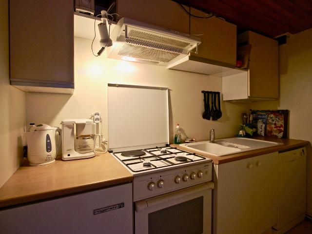 Equipée d'un frigo top, d'une cuisinière 3 feux gaz + 1 plaque électrique et four, et d'un lave-vaisselle cafetière filtre.