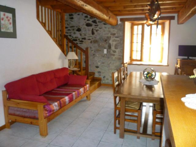 Appartement situé au 1er étage. Entrée commune avec un autre gite de 2 personnes. Séjour avec coin cuisine. Salle d'eau avec wc. 2ème étage : 1 chambre mansardée en mezzanine avec 1 lit 2 places et 1 lit 1 place. 1 chambre mansardée avec 1 lit 2 places. Chauffage électrique. Grand terrain commun clos. Local à skis. Parking. Salon de jardin. Barbecue. Location draps, linge de toilette sur demande. Tarif cure 3 semaines : 900 € en été, 600 € en moyenne saison, 500 € en basse saison et en hiver. Gîte aménagé dans une ancienne ferme, rénovée avec soin, qui comprend un autre logement de vacances sur le même palier. Pour profiter des plaisirs de la montagne ou de l'eau, stations de skis, chemins de randonnées, centre de remise en forme, station thermale... sont à proximité. Le soir venu, vous profiterez du grand terrain ombragé traversé par le télécabine dont le passage semble rythmer le temps. On apprécie la vue plongeante sur la ville d'Ax-les-Thermes située en contre bas.