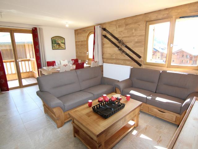 4 PIECES NEUF DE STANDING pour 6 personnes de 71m² situé au 1er étage de la résidence (pas d'escalier entre l’entrée de résidence et l'appartement), orienté SUD EST avec double balcon et vue sur massif du Beaufortain, 1 place de parking en sous-sol comprise dans le tarif de l'hébergement (N° 14, H: 2.28m) au niveau -2