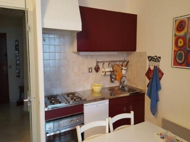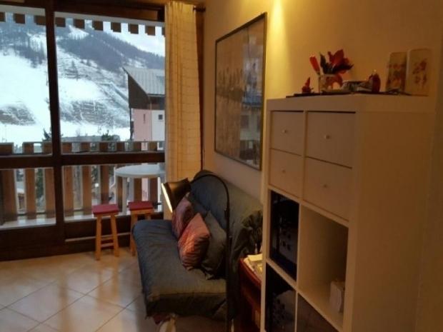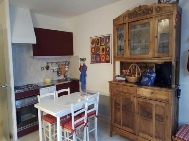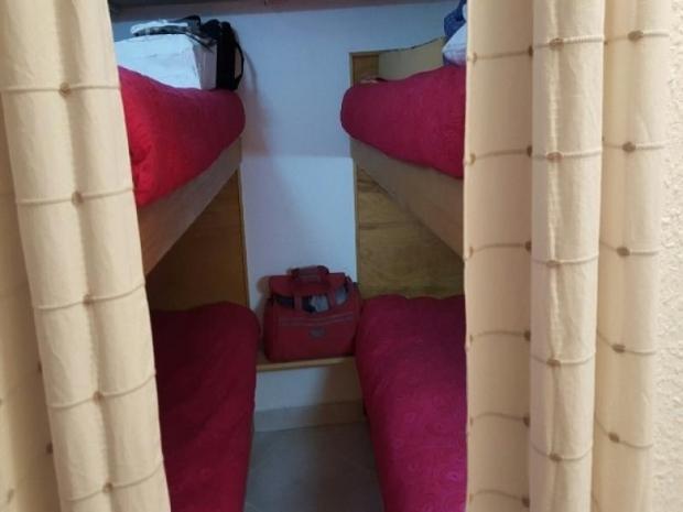 Il y a une entrée avec des rangements, un coin cabine avec des lits superposés et un lit simple, la salle d'eau, wc séparé, le salon avec un canapé convertible, télévision et balcon exposition sud, une kitchenette équipée de 4 plaques électriques, un frigidaire et un four.