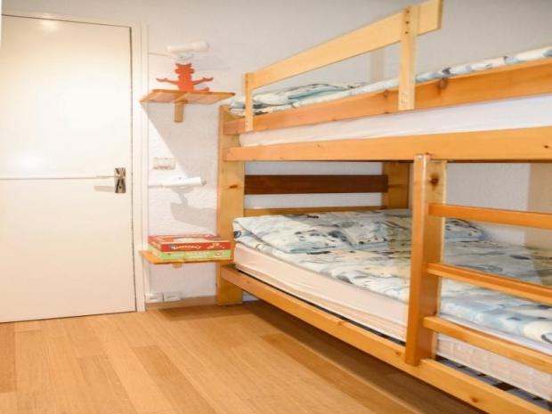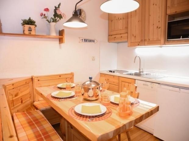 Le coin cuisine est équipé de plaques vitrocéramiques, d'un lave vaisselle et d'un micro ondes. Vous pourrez apprécier la chambre avec son lit en 160 cm et ses rangements ainsi que le coin montagne avec ses lits superposés et ses rangements.