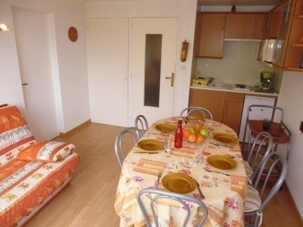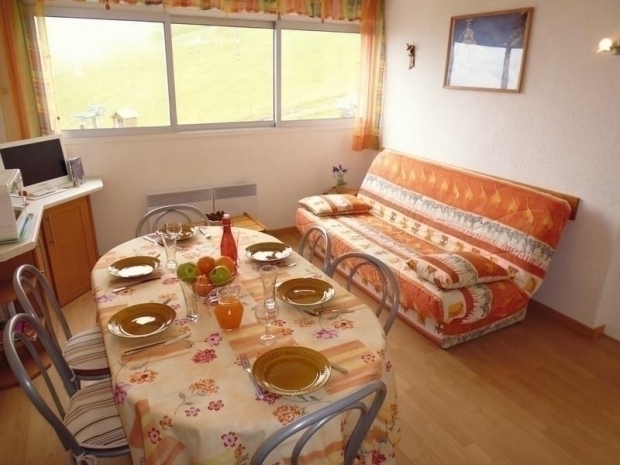 Appartement situé au 4ème étage, surface de 24m² sans balcon, exposition Est (vue vallée). Séjour équipé d?un téléviseur, d?un canapé clic clac pour deux personnes. Coin cabine avec deux lits superposés. Moquette au sol.