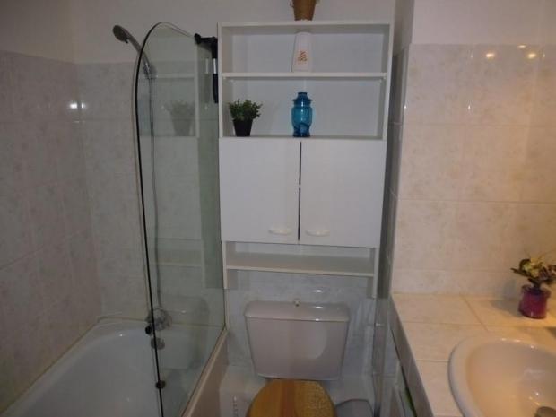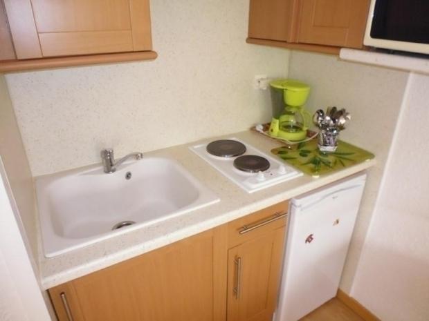 Cuisine ouverte sur séjour, avec plaques électriques deux feux, micro-ondes, frigo 110 litres, cafetière à filtre. Salle de bain comprenant : baignoire, lavabo et toilettes.