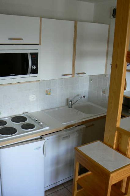 Appartement 2 pièces + alcove 30 m² pour 6 personnes, cabine fermée par rideau dans l'entrée avec 2 lits superposés, salle de bain avec baignoire et wc séparés ; Salon avec canapé lit 2 pers., télévision, lecteur DVD, coin repas et cuisine ouverte avec 4 plaques électriques, lave-vaisselle et micro-ondes. Une chambre parentale avec coin lavabo et accès balcon commun au séjour , exposé Sud avec vue dégagée sur la vallée.