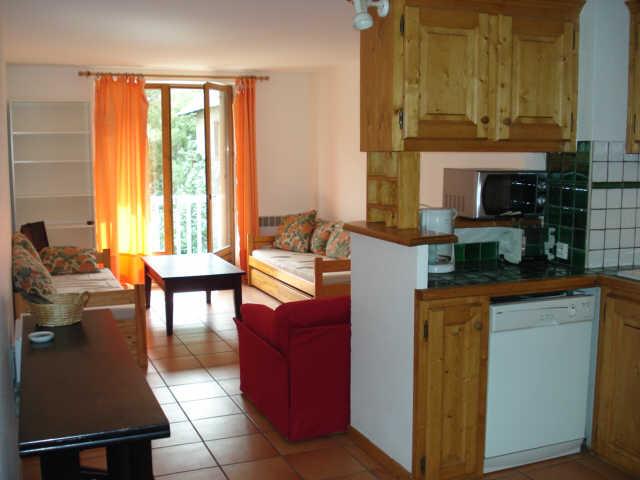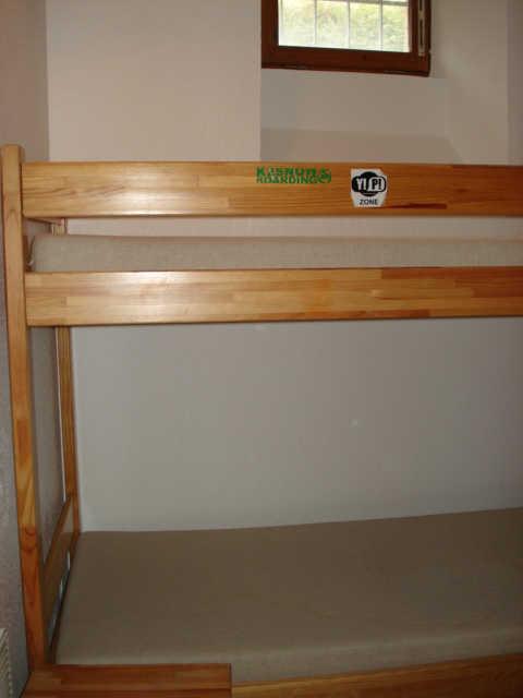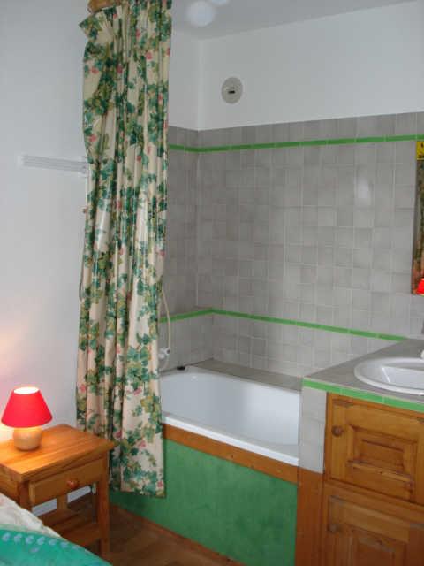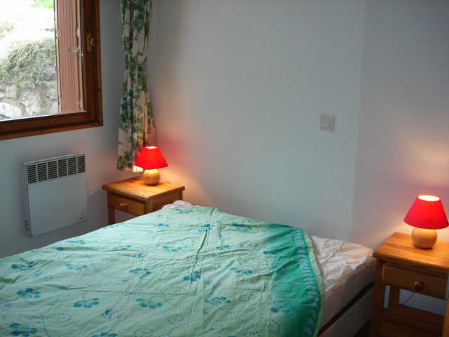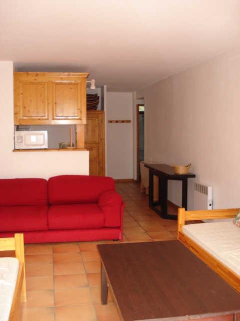 APPARTEMENT POUR 6 PERSONNES 43M² sud sans balcon au 1er étage sans ascenseur comprenant un séjour, coin cuisine, une salle d'eau avec WC, une chambre avec 1 lit 140 et une baignoire, une chambre avec lits superposés 80, casier à skis. Résidence située dans le village à 500m du télécabine de l'aravet et cours de ski.