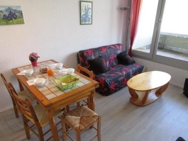 Situé au 6ème étage (accès résidence par escaliers, 23 marches), studio avec balcon, exposition Ouest (vue station et pistes). Séjour équipé d’un téléviseur, d’un canapé « BZ » pour deux personnes en 140. Coin nuit avec lits superposés (3x70 cm). Sol en parquet stratifié.