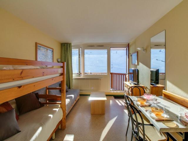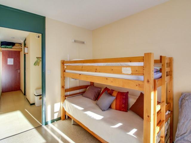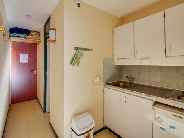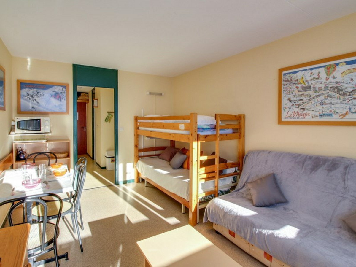 Studio de 23 m² situé au 6ème étage avec balcon exposition sud, face aux pistes. Séjour équipé d’une télévision, d'un poste radio /CD, de 2 canapés lits 2 places en 140. Kitchenette ouverte avec lave-vaisselle, 2 plaques induction, four micro-ondes, four, grand frigo avec compartiment congélateur, cafetière à filtre, senséo, grille-pain, bouilloire et appareil à raclette. Salle de douche comprenant : douche et lavabo. toilettes séparées. Sol en PVC. Studio non fumeur. Casier à skis face au studio.