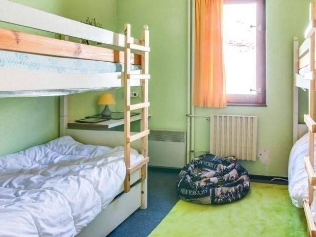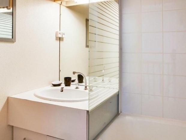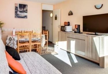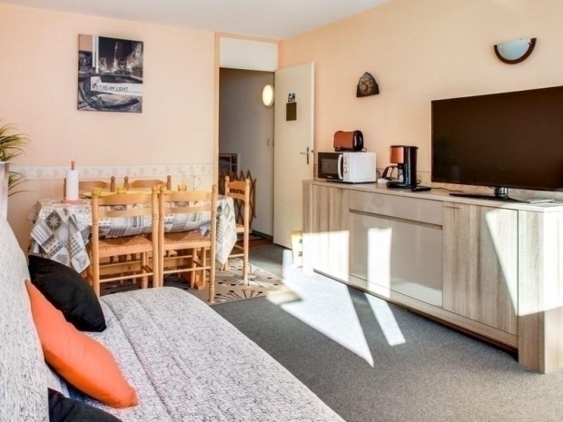 Appartement situé au 6ème étage, surface de 33 m² avec balcon exposition sud, vue sur les montagnes. Escalier intérieur accédant au séjour équipé d?une télévision, d?un canapé lit 2 places, chambre en exposition nord équipée de 2 x 2 lits superposés. Kitchenette fermée avec plaques électriques, four micro-ondes, minifour, frigo 110 litres, cafetière à filtre. Salle de bains comprenant : baignoire, lavabo, toilettes. Moquette au sol. Cellier de rangement face à l?appartement.