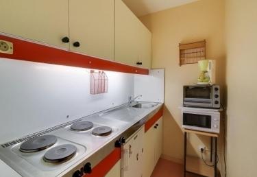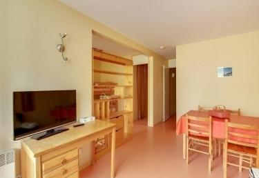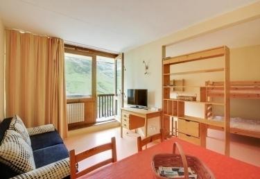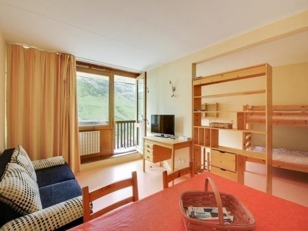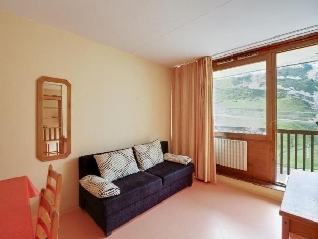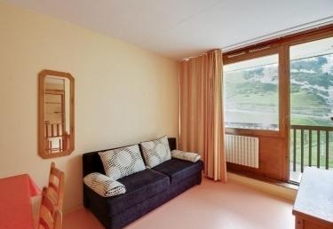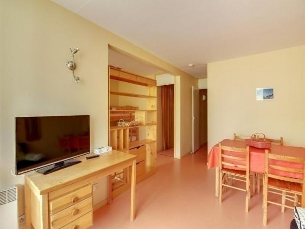 Studio situé au 2ème étage avec balcon, exposition sud, face aux pistes. Séjour équipé d?une TV, d?un canapé lit 2 places et de deux lits superposés dans un coin nuit attenant au séjour (non séparé). Coin cabine fermée avec deux lits superposés. Dressing. Kitchenette ouverte dans le séjour, avec 4 plaques électriques, micro-ondes, minifour, frigo 130 litres, cafetière à filtre. Salle de bains comprenant : baignoire, lavabo. Toilettes séparées. Cellier de rangement en face du studio. Sol en pvc.