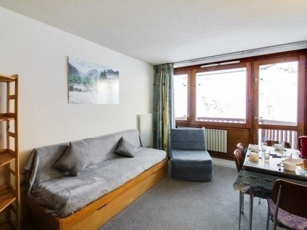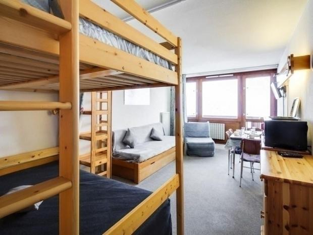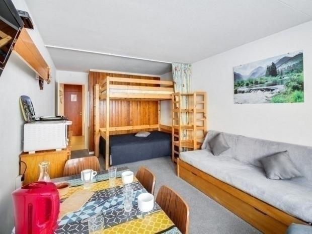 Situé au 7ème étage, balcon exposition sud, face aux pistes. Séjour équipé d?une TV, un canapé lit 2 places « gigogne » (2x80) et d'un lit mezzanine en 140cm. Kitchenette ouverte en entrée, avec 2 plaques électriques, , minifour, micro ondes, frigo 110 litres, cafetière à filtre, grille pain, bouilloire. Salle de bains avec toilettes. Casier à ski en face du studio.