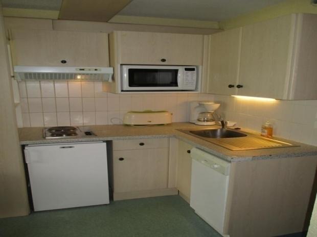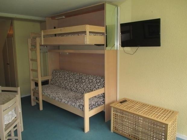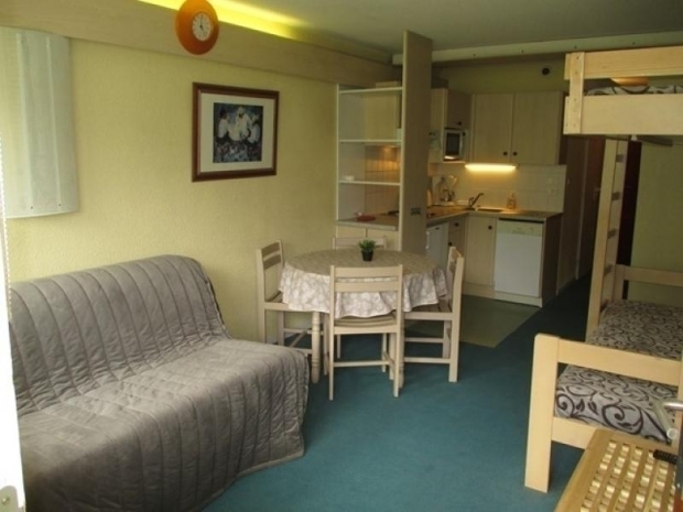 Situé au 5ème étage,balcon exposition sud, face aux pistes. Séjour équipé d?un téléviseur, d?un canapé lit 2 places, un lit simple et un lit en hauteur en 90; Kitchenette avec plaques électriques, micro ondes, minifour, lave vaisselle, frigo 110 litres, cafetière à filtre.. Salle de bains. Toilettes séparées. Casier à ski en face